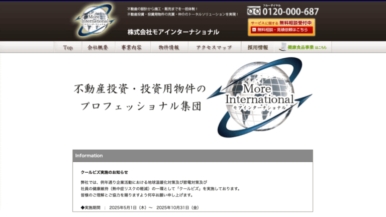 株式会社モアインターナショナルのホームページには、2025年8月時点で、東京23区内の駅近物件が2件掲載されていました。本社も東京都渋谷区に立地していることから、首都圏の物件を中心に取り扱っているものと考えられます。