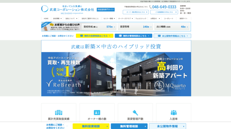 武蔵コーポレーションの物件ラインナップは、大きく分けて「再生中古物件(ReBreath)」と「新築アパート(MQuarto)」の二本柱で構成されています。
